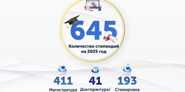 В 2025 году для обучения по программе «Болашак» выделено 645 стипендий. Из них по программам магистратуры – 411 стипендий, по докторантуре/резидентуре – 41 стипендия, по стажировкам – 193 стипендии.