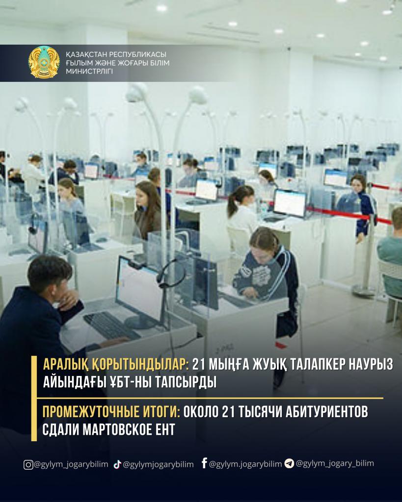 За первую неделю мартовского ЕНТ прошли около 21 тысячи абитуриентов. Пороговый балл преодолели примерно 57% участников. Средний балл по результатам тестирования составил 53 (по пяти предметам), а максимальный – 135 баллов, который набрал ученик из области Абай.
