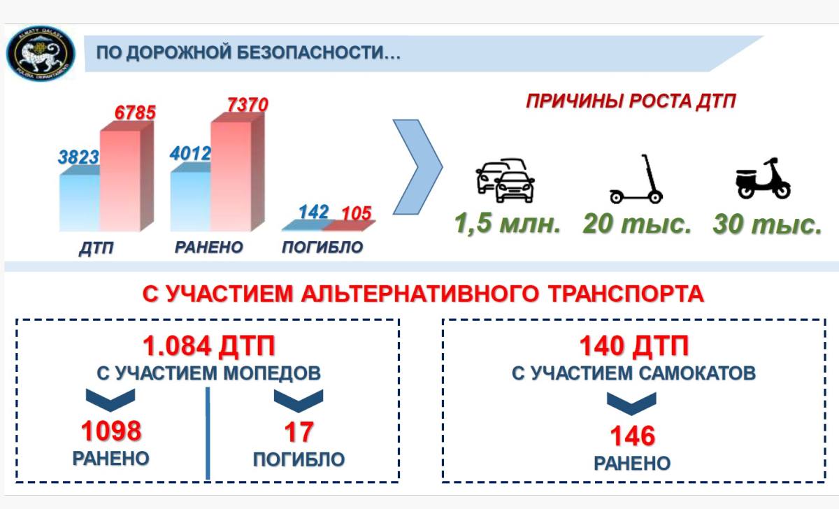 В прошлом году с участием мопедов в Алматы произошло 1 084 ДТП, в результате которых 1 098 человек получили травмы, еще 17 – погибли. Что касается самокатов, то имело место 140 ДТП, в которых три человека погибли, а 146 получили травмы.