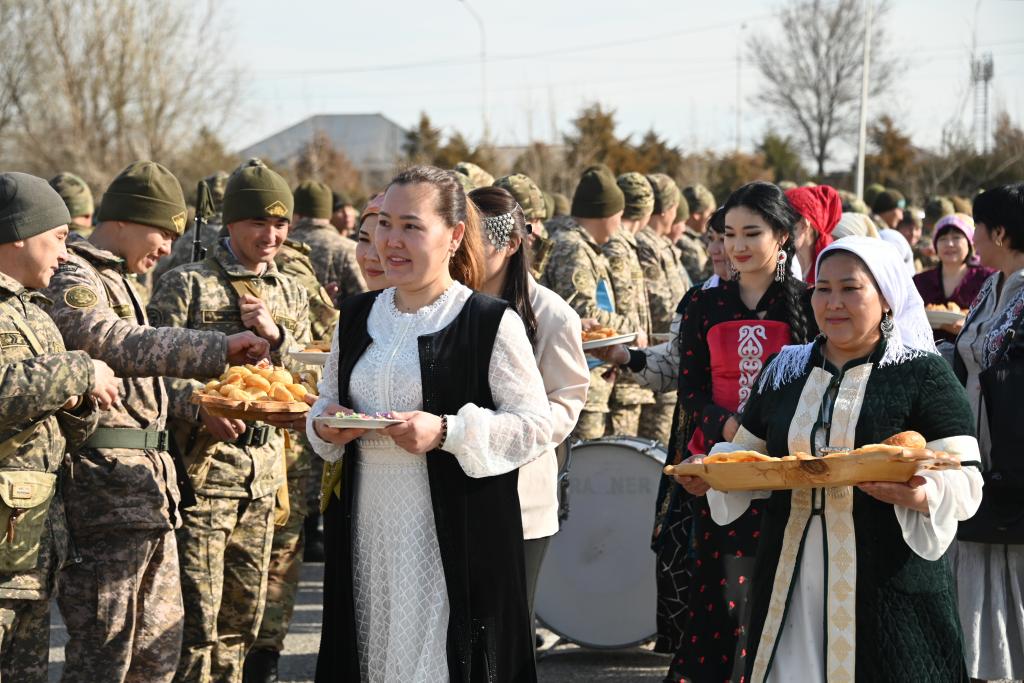 На контрольно-пропускном пункте военнослужащих встречали женщины в национальных костюмах, а на общем построении прошел традиционный обряд «шашу» — солдат срочной службы угостили казахскими сладостями. Атмосферу праздника поддержал военный оркестр бригады, исполнивший композиции, посвященные Наурызу.