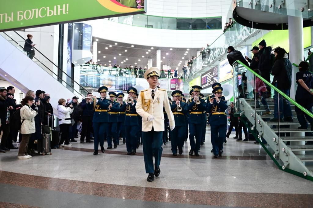 В честь дня весеннего равноденствия Центральный военный оркестр Национального военно-патриотического центра Вооруженных сил РК выступил в воздушной гавани столицы.