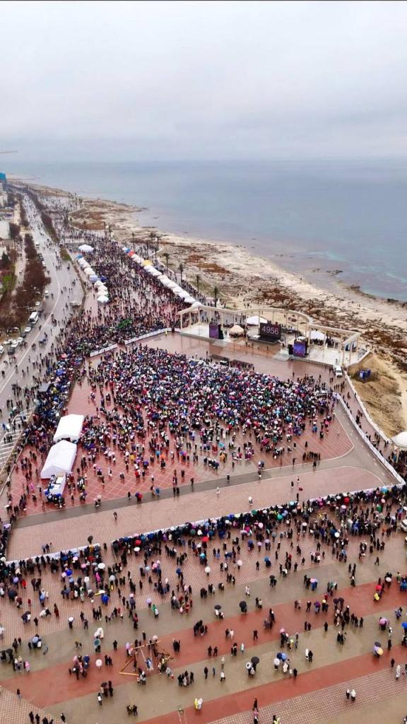 В день Наурыз мейрамы более 5 тысяч актаусцев, одетых в казахскую национальную одежду, собрались на побережье Каспия для установления рекорда Гиннеса в номинации «Самое большое количество людей в казахской национальной одежде».