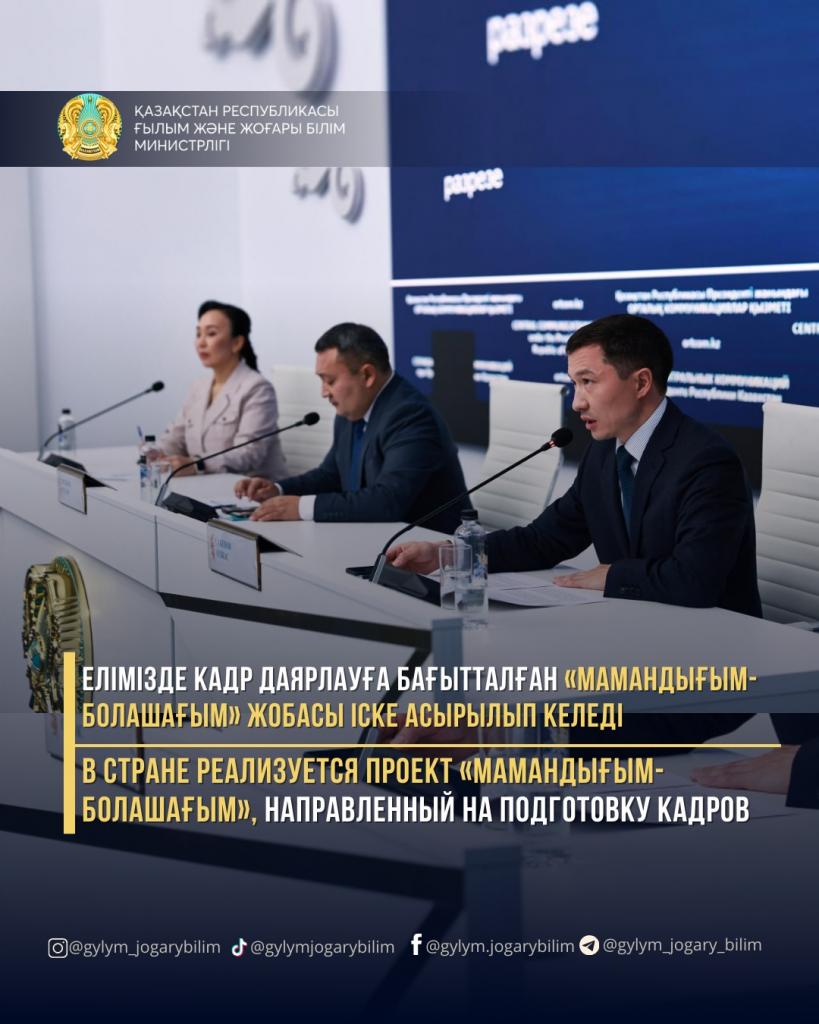 В ходе пресс-конференции руководитель офиса программы «Мамандығым – Болашағым» Олжас Сакенов в своем выступлении отметил, что в соответствии с поручением Главы государства и в рамках реализации Комплексного плана «Программа повышения доходов населения до 2029 года», с 2022 года в Казахстане успешно реализуется проект «Мамандығым – Болашағым», направленный на переформатирование системы подготовки кадров с учетом актуальных запросов региональных рынков труда.