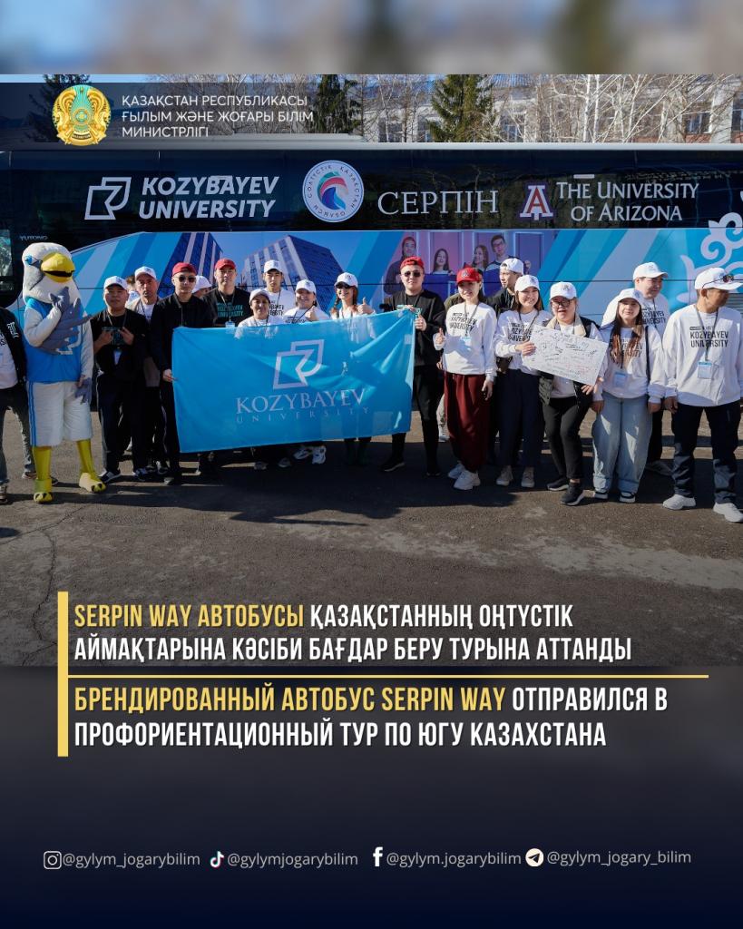 Сегодня брендированный автобус Serpin Way Kozybayev University отправился с Петропавловска в профориентационный тур по южным регионам страны. Караван Serpin Way с 1 по 20 апреля преодолеет в пути свыше 6500 км и посетит порядка 30 населенных пунктов – крупных городов, поселков, аулов.