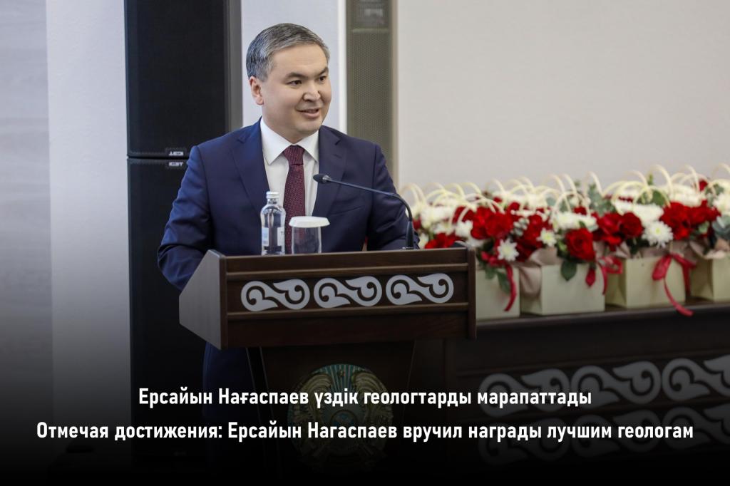Министр Ерсайын Нагаспаев в своей поздравительной речи подчеркнул неоценимый вклад геологов в развитие нашей страны, благодаря чему в текущем году площадь изученных недр достигла 2 млн км².