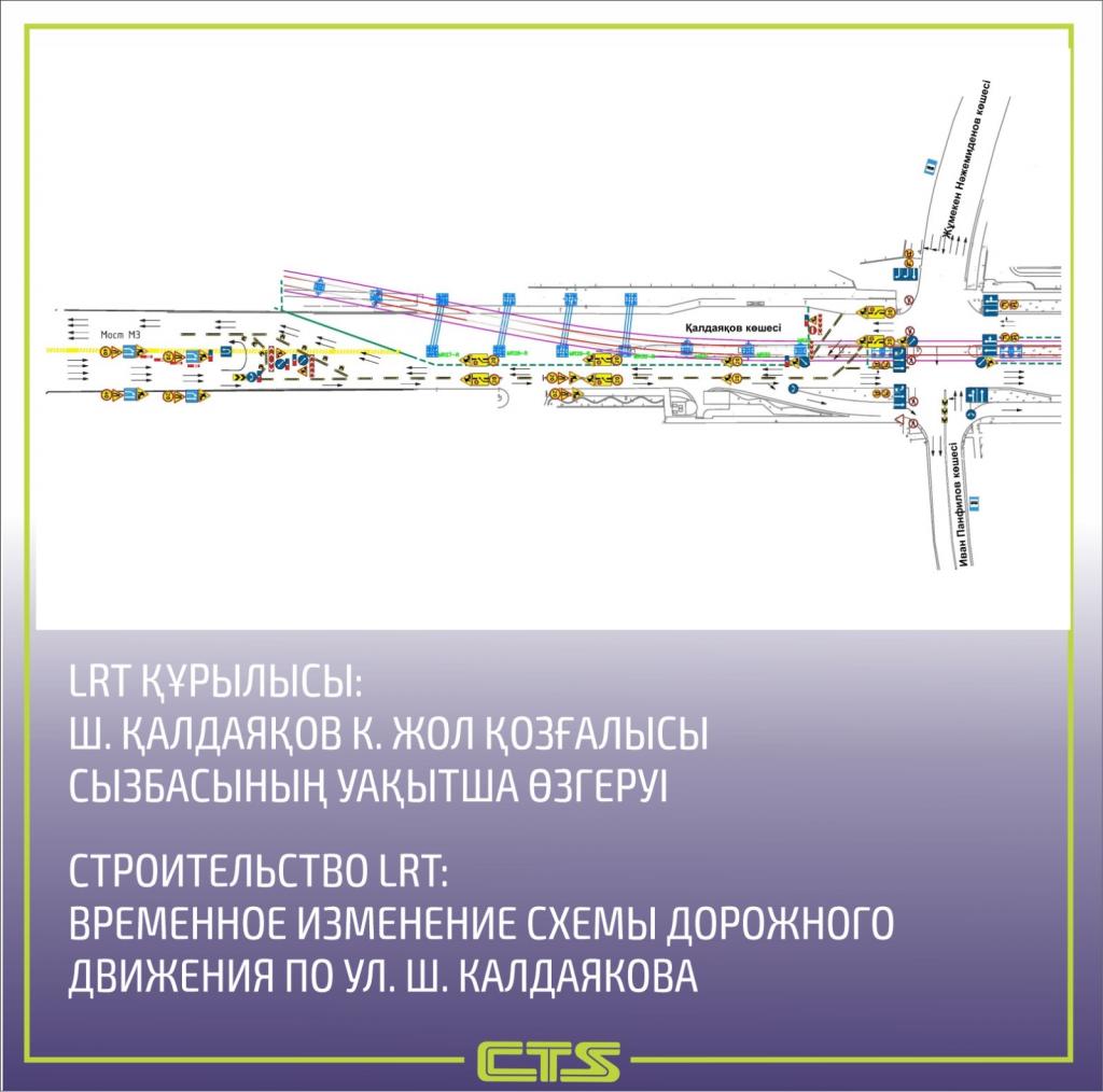 • с 10 апреля по 25 апреля в связи с проведением работ по переустройству инженерных сетей, планируется полное перекрытие движения по улице Ш. Калдаякова, на участке от проспекта Тауелсиздик в сторону улицы Ж. Нажимеденова;