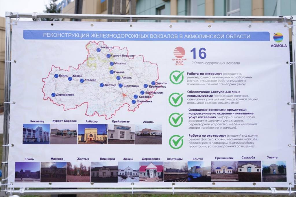 «Охватили как вокзалы больших городов, так и населенных пунктов, отдаленных районов. К примеру, в Восточно-Казахстанской области отремонтируем 5 железнодорожных вокзалов, в Акмолинской области — 16, в Атырауской области — 9, в Алматинской области — 5, в Актюбинской области — 7, в области Абай — 10, в области Жетысу — 8, в ЗКО — 4, а в Карагандинской области – 11 вокзалов. Аналогичные работы проходят и в других областях страны», — добавил вице-министр транспорта.