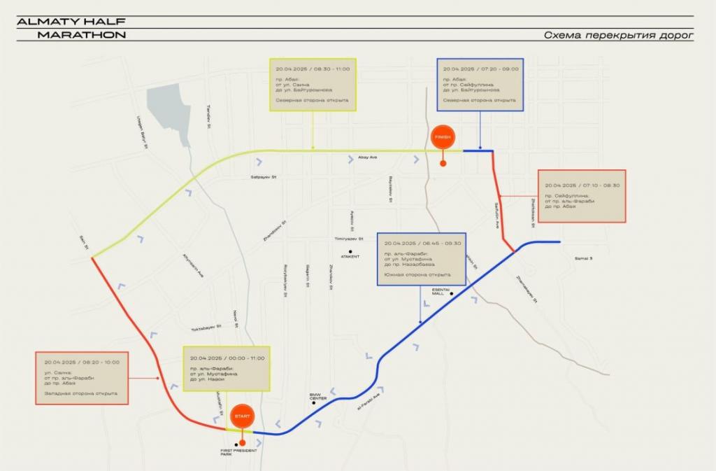 Старт будет дан в Парке Первого Президента в 7:00 утра. Движение на участке дороги по северной стороне пр. аль-Фараби от ул. Мустафина до ул. Навои будет перекрыто с 00:00 до 11:00 часов 20 апреля. Южная сторона будет открыта.