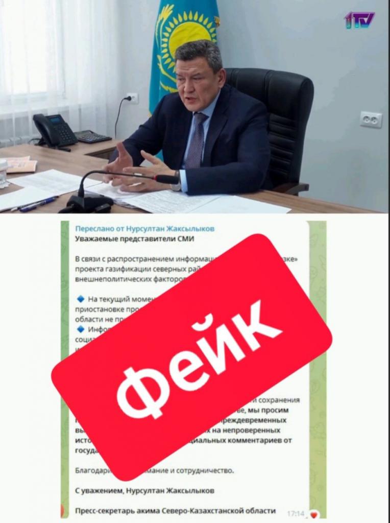 В последнее время участились случаи информационных атак в адрес Северо-Казахстанской области. Сейчас в соцсетях распространяется фейковое сообщение от имени пресс-службы акима области про газификацию, сопровождаемое фейковым видео с участием главы области Гауеза Нурмухамбетова, сгенерированный с помощью искусственного интеллекта.