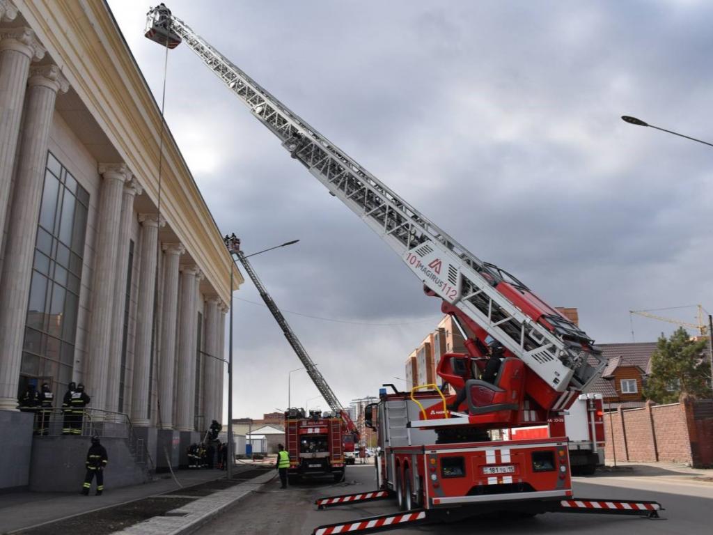 В городе Петропавловске Северо-Казахстанской области пожарные отработали действия по эвакуации людей из здания с массовым пребыванием — театра. По легенде, пожар возник в столярной мастерской цокольного этажа. Отработаны действия персонала, работа системы оповещения, а также оказание помощи пострадавшим.