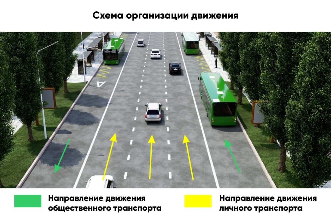 В целях минимизации конфликтных ситуаций, вызванных парковками и заторами, организация полос BRT предусмотрена по краям проезжей части. То есть в северном направлении выделенная полоса будет проходить по правой стороне, в обратном – по левой стороне проезжей части. Для личного автотранспорта сохраняется одностороннее движение на север от проспекта Абая, также сохраняется количество полос.