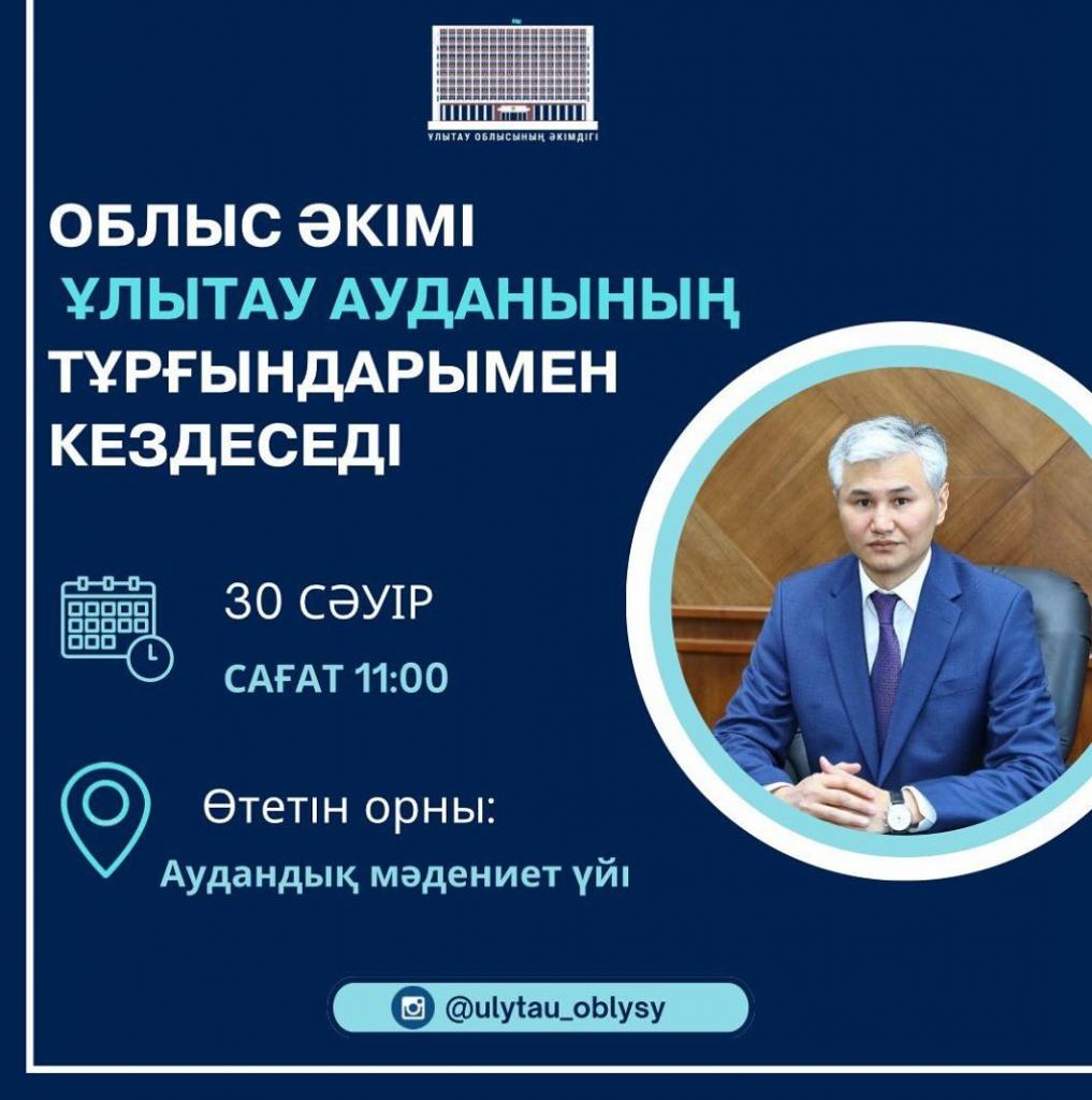 30 апреля 2025 года в 11:00 часов состоится встреча акима области Ұлытау Дастана Рыспекова с населением Улытауского района.