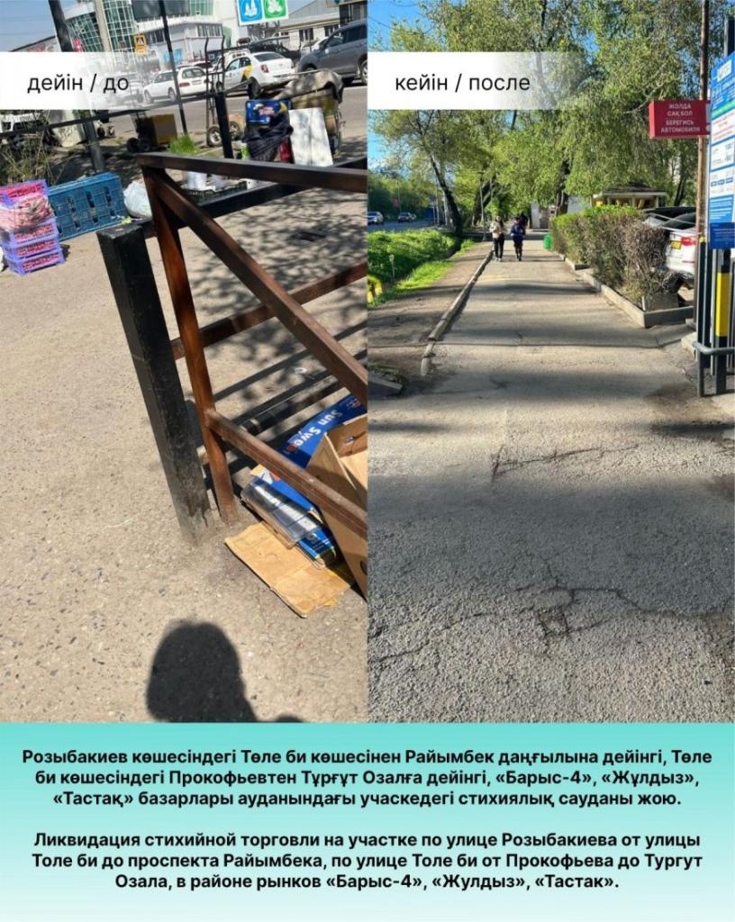 В Алматы реализуется кампания по поручению акима Ерболата Досаева в рамках республиканской программы «Таза Қазақстан» и городской инициативы «Алматы — наш общий дом». В частности, в Алмалинском районе Алматы проводятся активные работы по ликвидации стихийной торговли на участке по улице Розыбакиева от улицы Толе би до проспекта Райымбека (направление восток — запад) и по улице Толе би от Прокофьева до Тургут Озала, в районе рынков «Барыс-4», «Жулдыз», «Тастак».