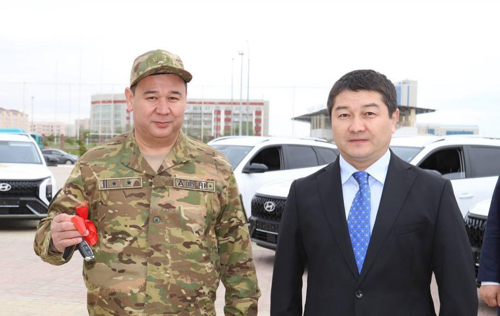 В торжественной церемонии передачи ключей от внедорожников приняли участие аким Мангистауской области Нурдаулет Килыбай и представитель департамента организационно-мобилизационной работы Генерального штаба Вооруженных сил РК полковник Нурлан Уали. Они поздравили военнослужащих с наступающим праздником и пожелали успехов в службе.