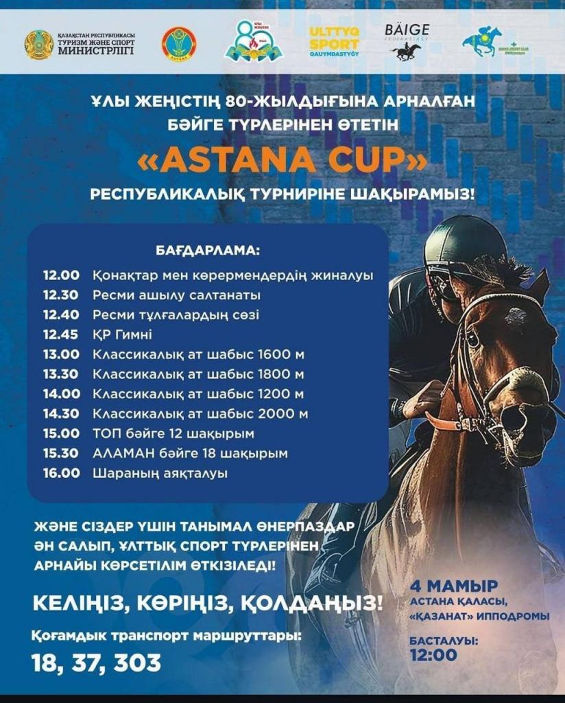 4 мая на столичном ипподроме «Қазанат» состоится масштабный турнир по классическим конным скачкам и байге Astana Cup. Соревнования соберут лучших скакунов со всех регионов страны.