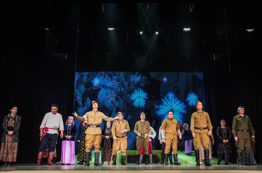При поддержке Архива Президента Республики Казахстан в фойе театра была организована выставка исторических фотографий и документов, посвященная теме Великой Отечественной войны.