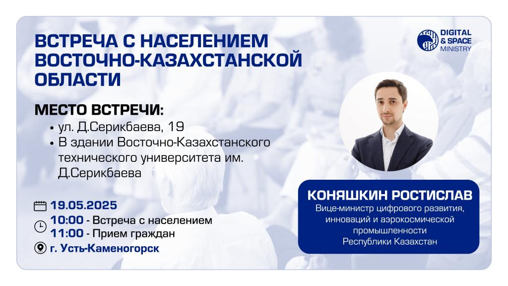 19 мая в 10.00 часов Вице-министр цифрового развития, инноваций и аэрокосмической промышленности РК Ростислав Анатольевич Коняшкин проведёт прием граждан по вопросам, входящим в компетенцию Министерства и в 11.00 часов встречу с населением Восточно-Казахстанской области в здании Восточно-Казахстанского технического университета им. Д.Серикбаева (адрес: г.Усть-Каменогорск ул. Д.Серикбаева, 19).