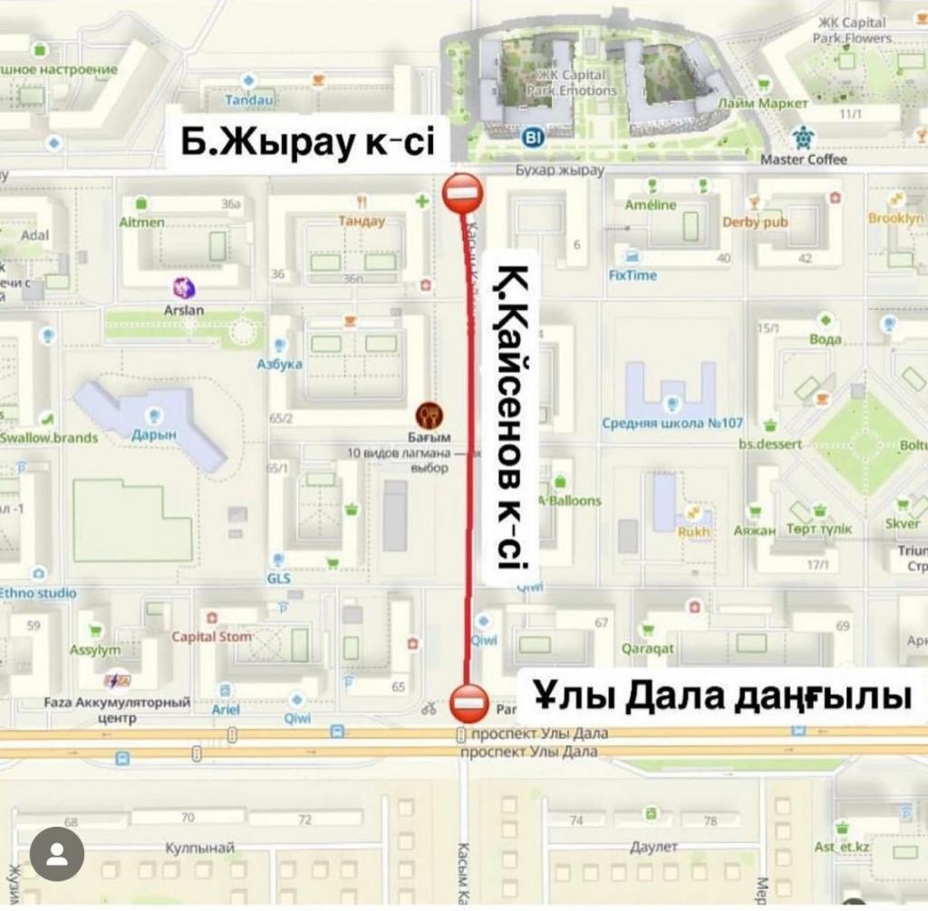 — с 20 апреля по 20 августа — ул. К. Кайсенова на участке ул. Бухар Жырау до пр. Тауелсиздик (альтернативное движение имеется по внутриквартальным проездам);