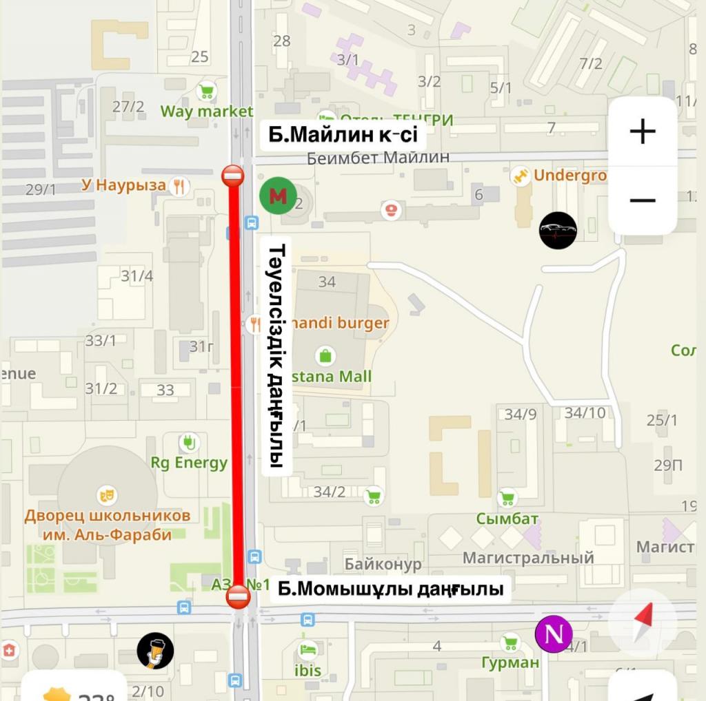 Также с 21 по 22 мая будет частично пепекрыто движение на участке от ул. Б. Майлина до пр. Б. Момышулы.