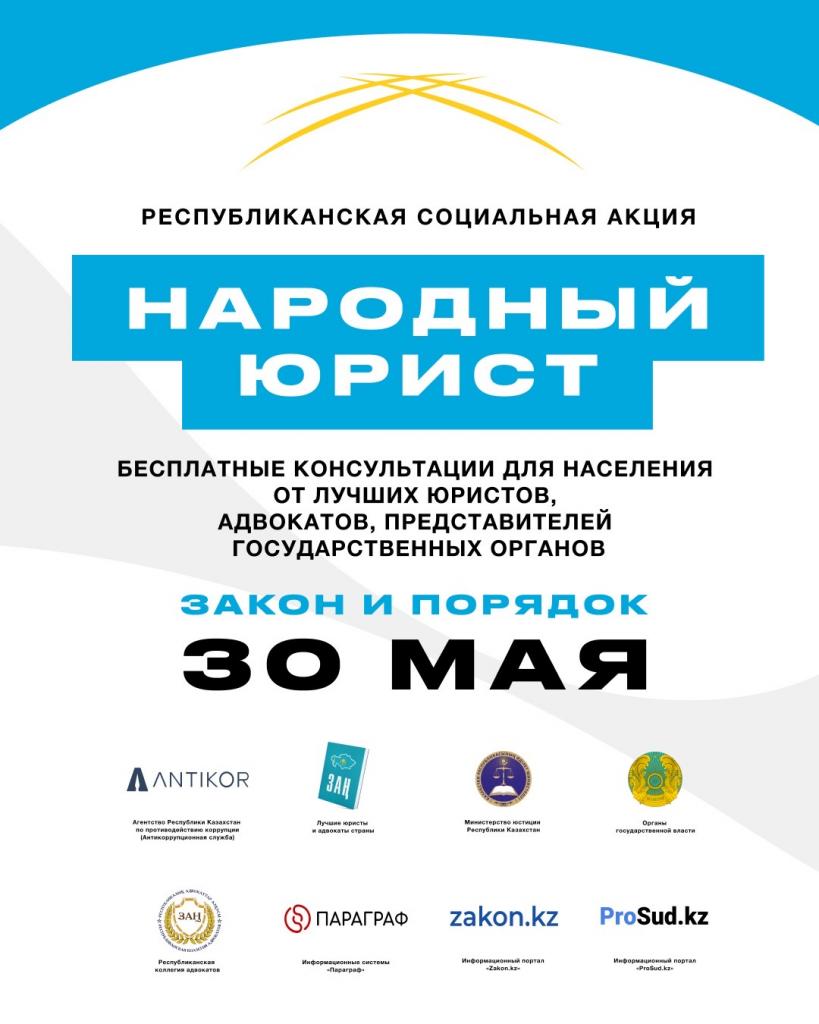 В крупных городах страны, в том числе и Астане 30 мая проведут республиканскую акцию «Народный юрист». Любой желающий сможет получить бесплатную юридическую консультацию и напрямую обратиться к представителям государственных органов, передает Optimism.kz.