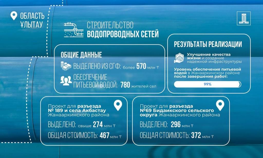 В Казахстане доступ к услугам водоснабжения в городских населенных пунктах составляет 99,4%, в сельских населенных пунктах – 97,8%. В области Ұлытау – в городах 100%, в селах 97,3%.
