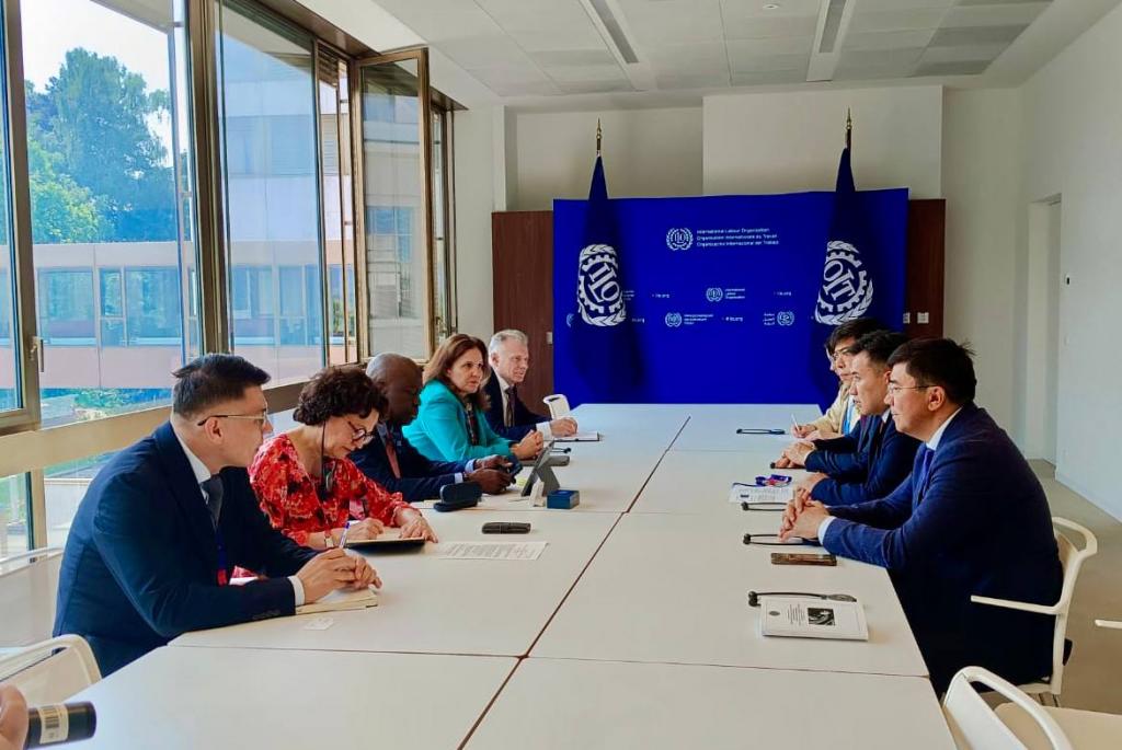 Первый вице-министр труда и социальной защиты населения РК Аскарбек Ертаев в рамках рабочей поездки в Швейцарию для участия на 113 сессии Международной конференции труда накануне встретился с Генеральным директором Международной организации труда (далее – МОТ) Жильбером Унгбо. В ходе диалога стороны обсудили развитие законодательных инициатив в сфере труда и принятие конвенций МОТ.