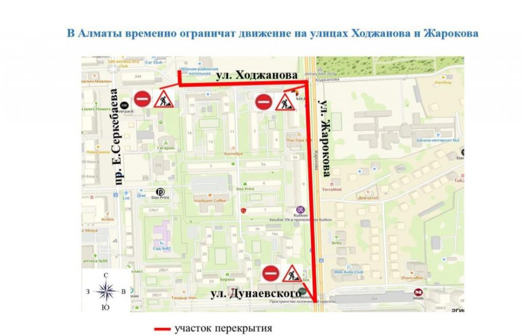 С 10 июня по 1 сентября движение автотранспорта будет ограничено на улице Ходжанова от улицы Гагарина до улицы Жарокова, а также на улице Жарокова от улицы Ходжанова до улицы Дунаевского в южном направлении. Движение в северном направлении будет организовано в обоих направлениях.