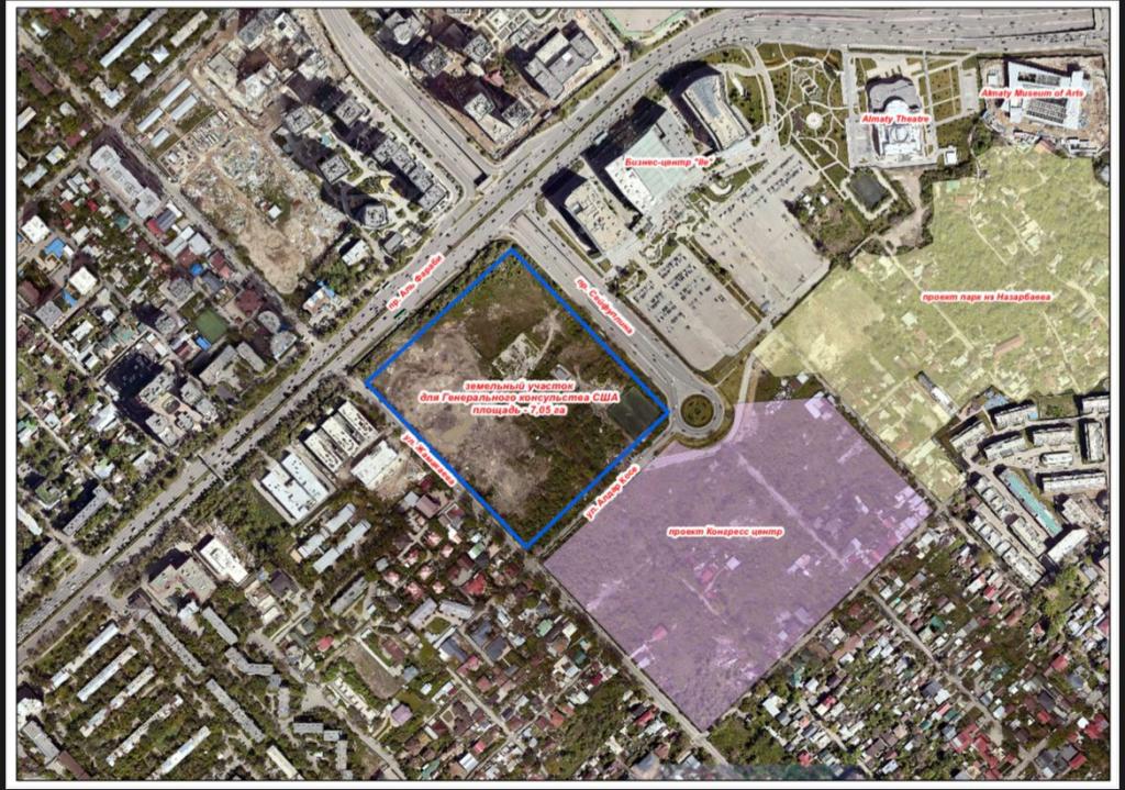 Границы участка: пр. аль-Фараби (юг) – пр. Сейфуллина (запад) – ул. Алдар Косе (север) – ул. Жамакаева (восток)