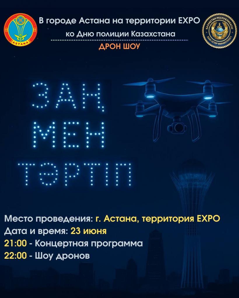 В районе ЭКСПО в Астане пройдет световое шоу дронов, приуроченное ко Дню казахстанской полиции, сообщает Optimism.kz.