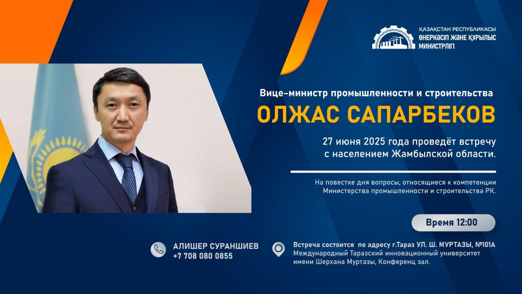 27 июня 2025 года вице-министр промышленности и строительства РК Олжас Сапарбеков проведёт встречу с населением Жамбылской области