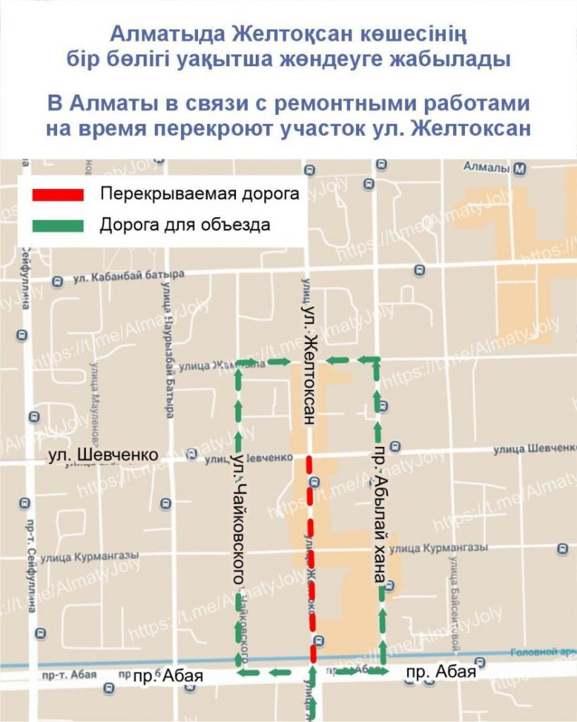 Напомним, вся информация касательно ограничений движения размещена в Telegram-канале @AlmatyJoly, в социальных сетях акимата, а также в сервисах 2GIS и «Яндекс карты».