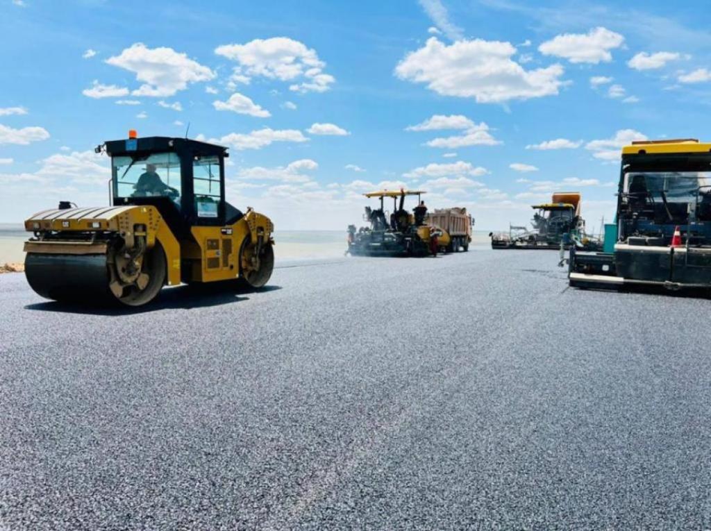 Верхний слой покрытия уложен на 560 километра. В том числе в Туркестанской области 90 километра, Карагандинской — 47 и Акмолинской — 68 километра.