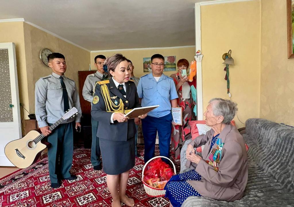 Военнослужащие и курсанты Военно-инженерного института радиоэлектроники и связи совместно с представителями управления по делам обороны Алмалинского района города Алматы поздравили участницу Великой Отечественной войны Екатерину Александровну Баранову со 100-летием.