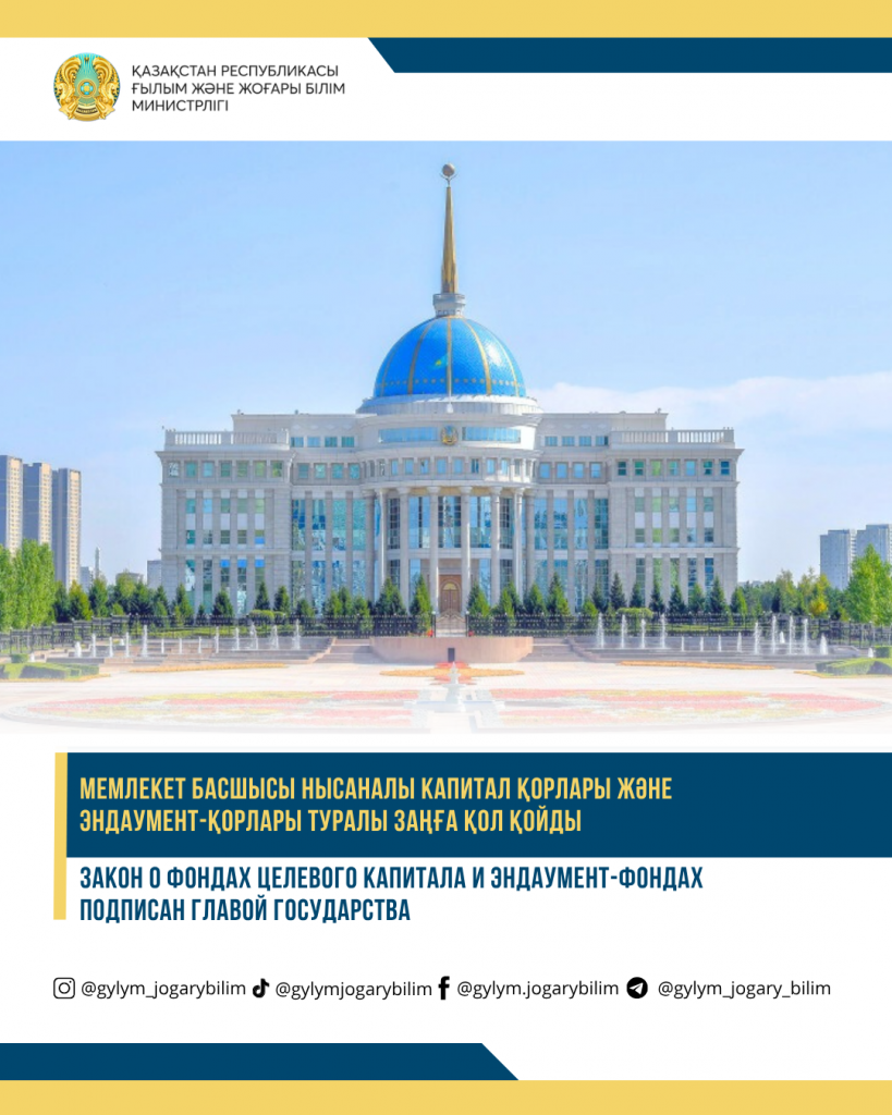 Сегодня, 30 июня 2025 года, Главой государства подписан Закон Республики Казахстан «О фондах целевого капитала и эндаумент-фондах (целевых капиталах)».