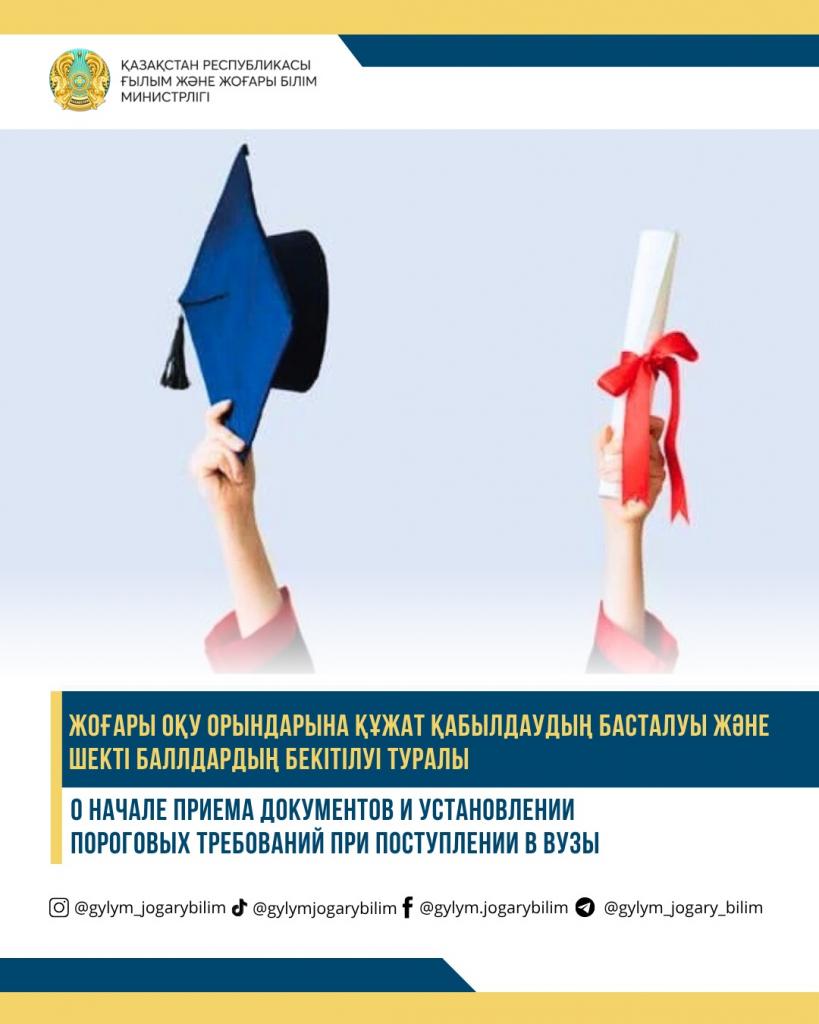 Министерство науки и высшего образования РК информирует о начале приема документов для поступления в высшие учебные заведения страны на 2025-2026 учебный год.