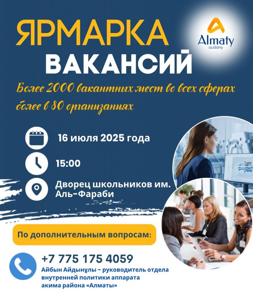 Ярмарка вакансий начнется в 15:00 часов 16 июля во Дворце школьников имени Аль-Фараби по адресу проспект Б.Момышулы, 5.