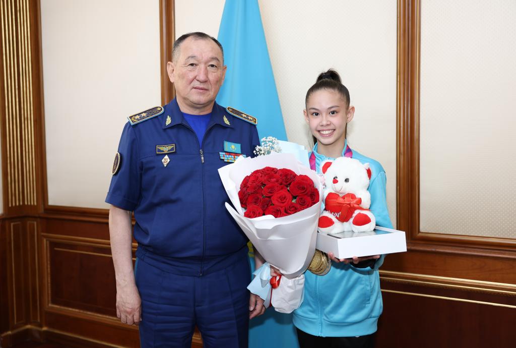 Глава оборонного ведомства генерал-лейтенант авиации Даурен Косанов поздравил дочь военнослужащего, гимнастку Акмарал Ерекешеву, с блестящей победой на юниорском чемпионате мира.