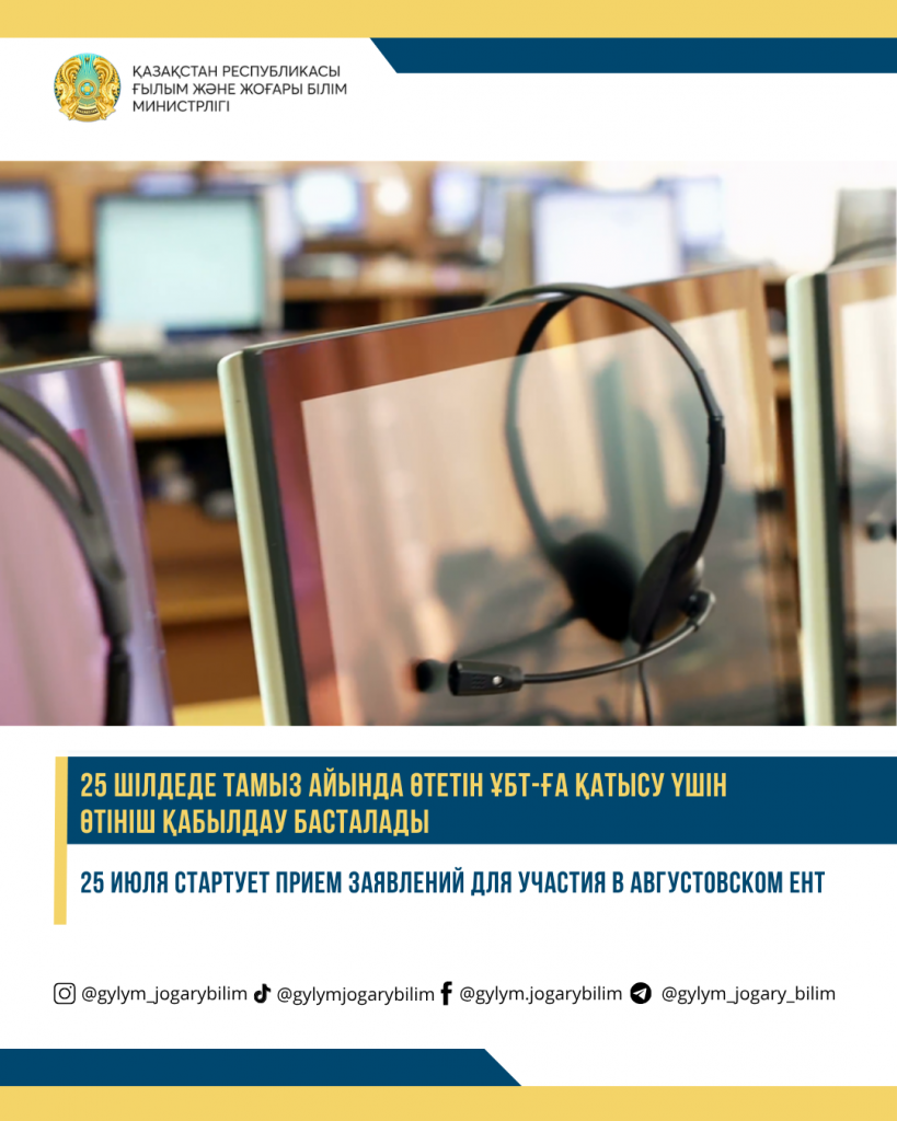25 июля стартует прием заявлений для участия в августовском ЕНТ и продлится до 5 августа. Зарегистрироваться можно будет на сайте Национального центра тестирования app.testcenter.kz. Само тестирование пройдет в период с 10 по 14 августа.