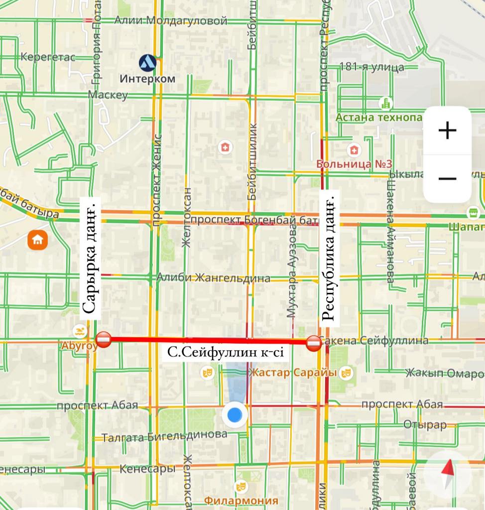 При этом движение автотранспортных средств будет организовано в одном направлении сначала в сторону пр. Республики, затем в сторону пр. Сарыарка.