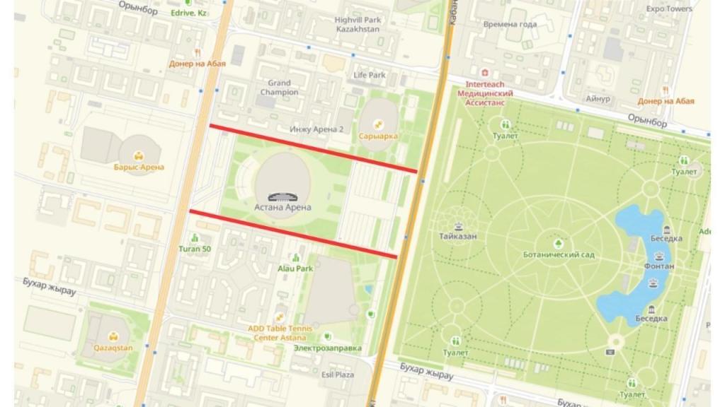В связи с проведением масштабного концерта, с целью обеспечения общественной безопасности, комфортного подъезда и передвижения гостей мероприятия, будет временно ограничено движение автотранспорта в районе стадиона «Астана Арена» — со стороны Ледового дворца «Алау» и велотрека «Сарыарка».