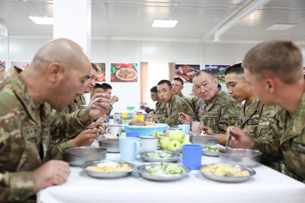 Во время обеда в солдатской столовой генерал-лейтенант авиации Даурен Косанов лично оценил разнообразие и качество приготовленных блюд.