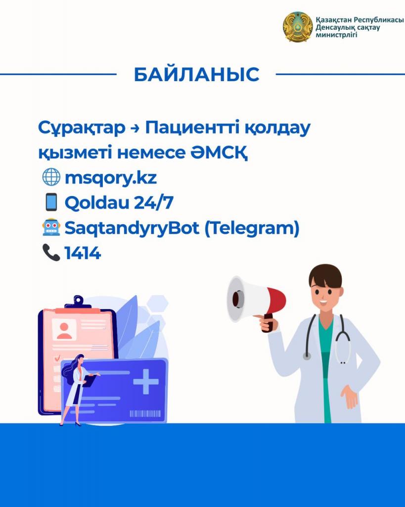 Егер сізде әлі де сұрақтар болса Сіз өзіңіздің емханаңыздың пациенттерді қолдау қызметіне немесе әлеуметтік медициналық сақтандыру қорына жүгіне аласыз:
