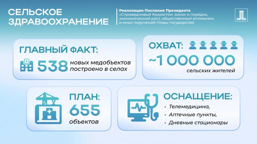 В соответствии с поручениями Президента в стране реализуется национальный проект «Модернизация сельского здравоохранения», направленный на обновление медицинской инфраструктуры и внедрение современных технологий лечения.