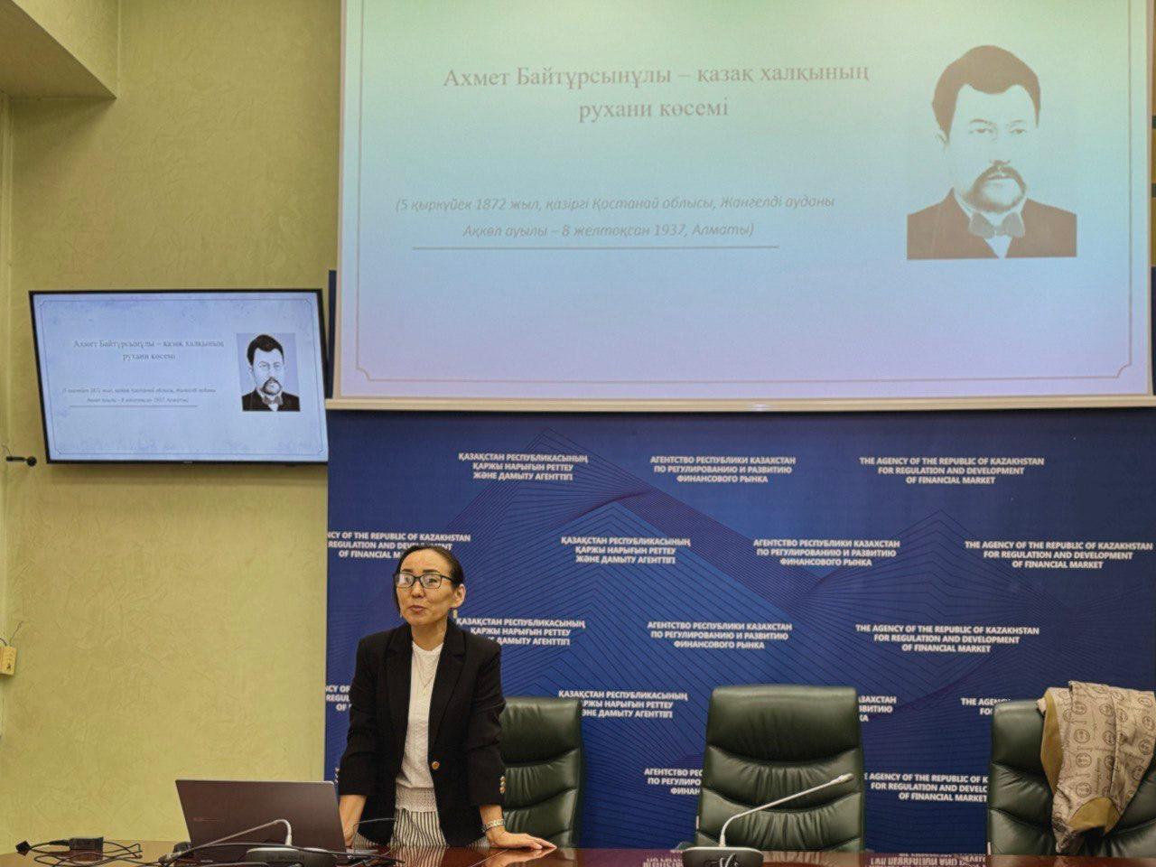 Ассоциированный профессор Казахско-турецкого университета имени Сулеймана Демиреля (SDU University), кандидат филологических наук Баян Керімбекова провела лекцию-урок для работников Агентства на тему «Ахмет Байтурсынулы – духовный лидер казахского народа».