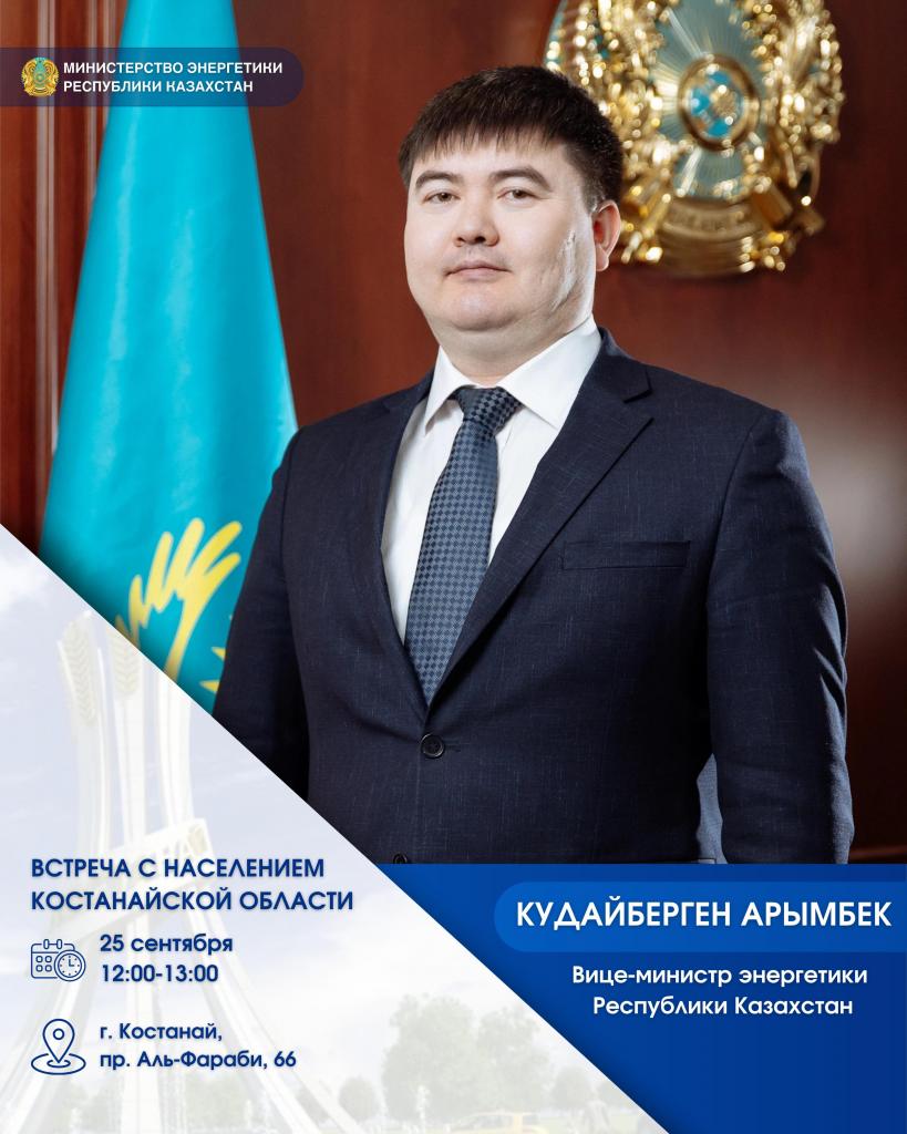 25 сентября 2025 года в 12:00 часов (г. Костанай, пр. Аль-Фараби 66) состоится встреча вице-министра энергетики Республики Казахстан Кудайбергена Арымбек с населением Костанайской области.