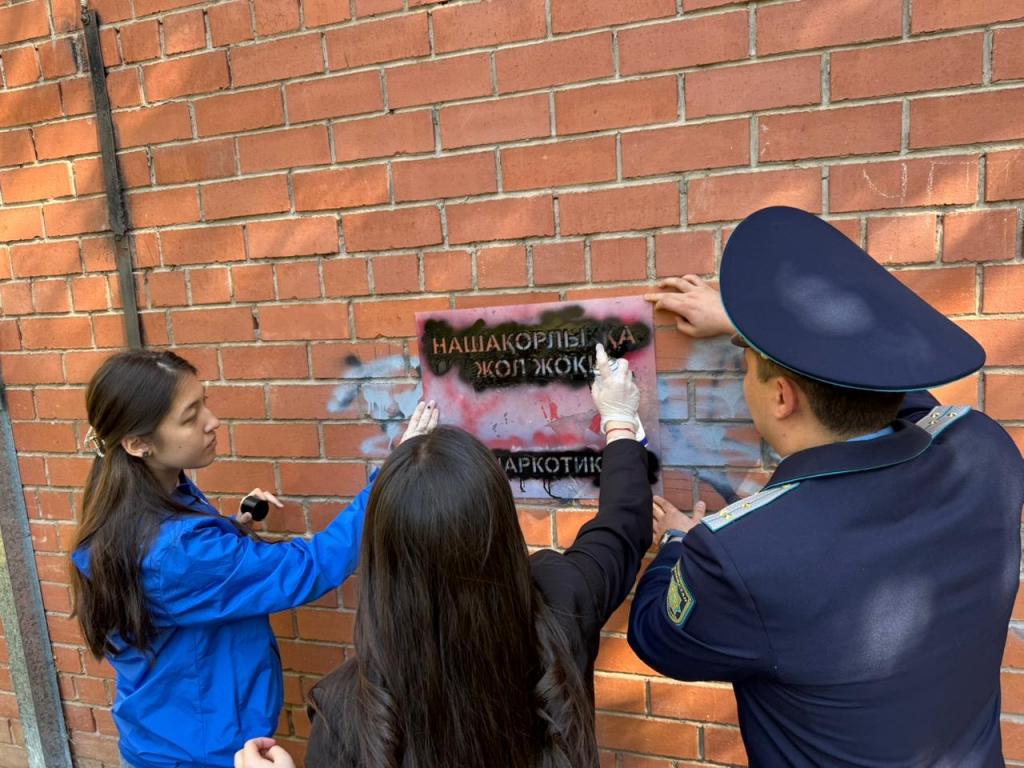 Антинаркотическая акция прошла в районе Байқоныр. Ее участники выявляли и закрашивали надписи, содержащие скрытую рекламу наркотиков с указанием ссылок на мессенджеры, через которые продают запрещенные вещества. Такие наркограффити нередко появляются на фасадах жилых домов, трансформаторных подстанциях, заборах и других общественных объектах.