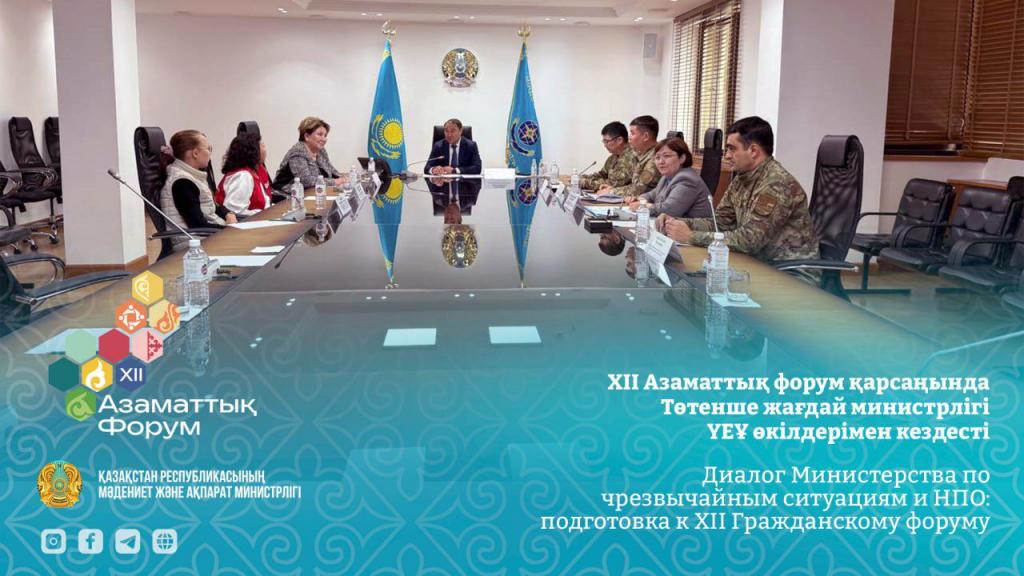 Сегодня, 30 сентября 2025 года, в преддверии XII Гражданского форума Казахстана состоялась встреча Вице-министра по чрезвычайным ситуациям Кегена Турсынбаева с неправительственными организациями и волонтёрскими объединениями. Обсуждение было посвящено вопросам укрепления взаимодействия в сфере предупреждения и ликвидации чрезвычайных ситуаций.
