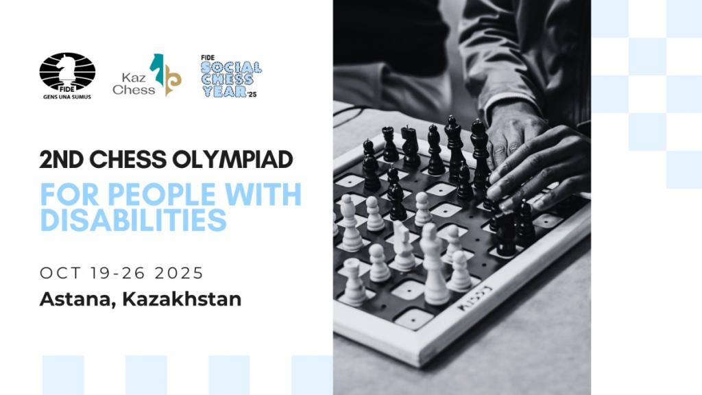 С 20 по 25 октября 2025 года в Астане пройдёт 2-я шахматная Олимпиада для людей с особыми потребностями (2nd Chess Olympiad for People with Disabilities) с участием 35 команд из 32 стран.