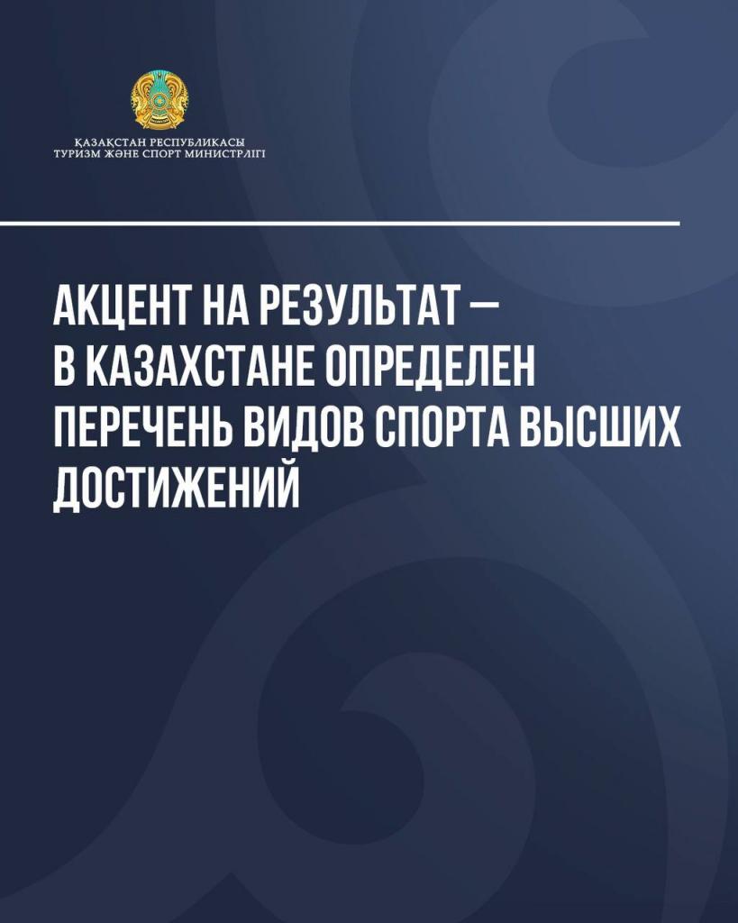 Министерство туризма и спорта Республики Казахстан утвердило перечень видов спорта высших достижений. В него вошли 65 видов спорта, представленных в программах Олимпийских, Паралимпийских, Сурдлимпийских, Азиатских и Параазиатских игр, а также национальные виды спорта.