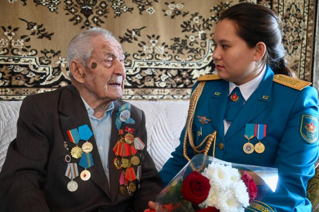 Они вручили ветерану поздравительное письмо от имени министра обороны генерал-лейтенанта авиации Даурена Косанова и памятные подарки.